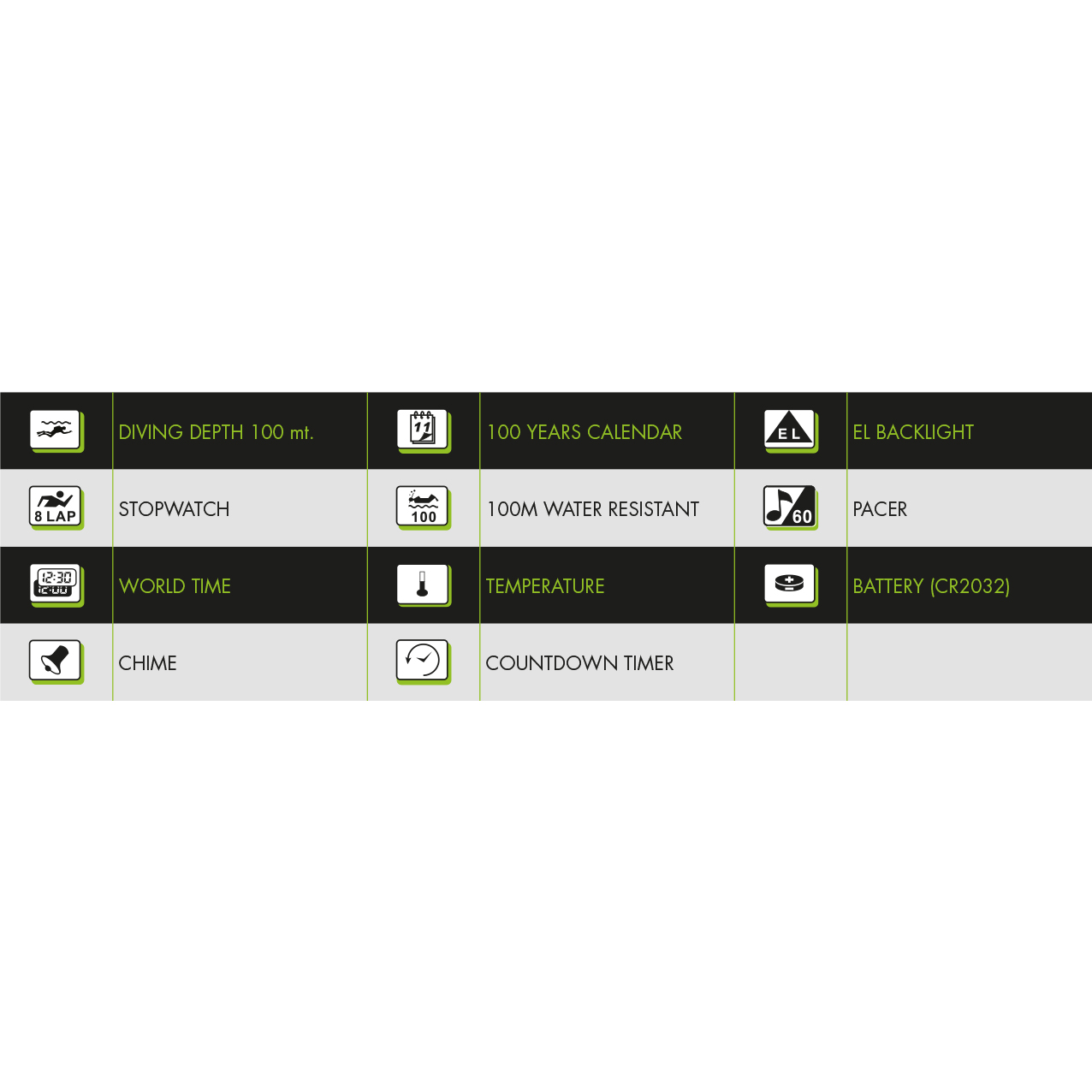 Profundidad de 100m, tiempo de inmersión, tiempo en superficie y temperatura del agua.